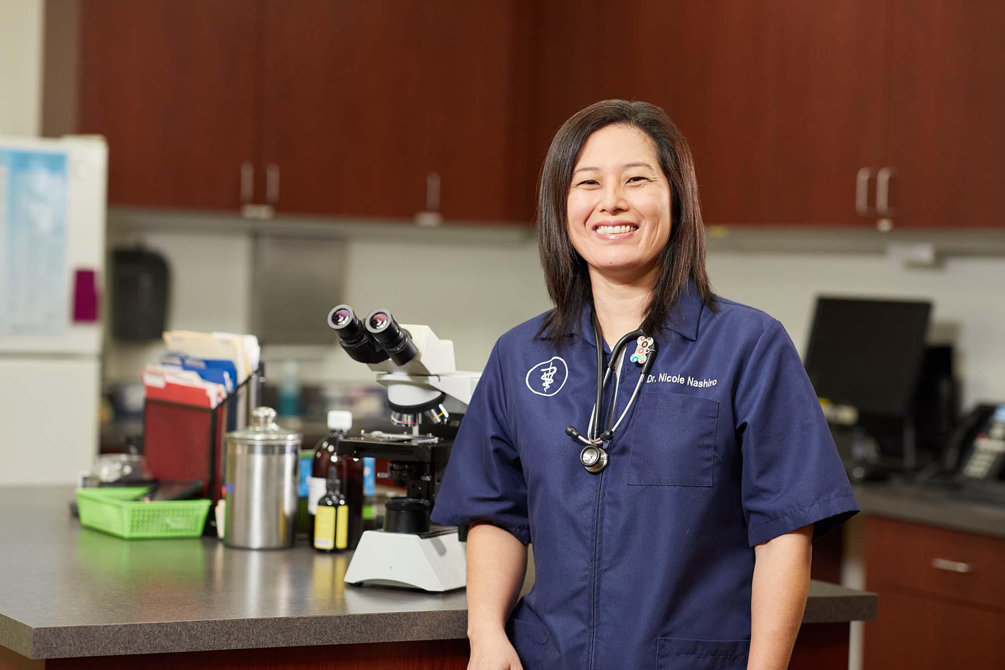 Dr. Nashiro showed her interest in animals at a young age. While attending McKinley High School, she volunteered at the Hawaiian Humane Society, Honolulu Zoo and Waikiki Aquarium. After graduating from UH Manoa, she received her veterinary medicine degree from Colorado State University. She believes in integrating Eastern and Western medicine into her treatment of pets.